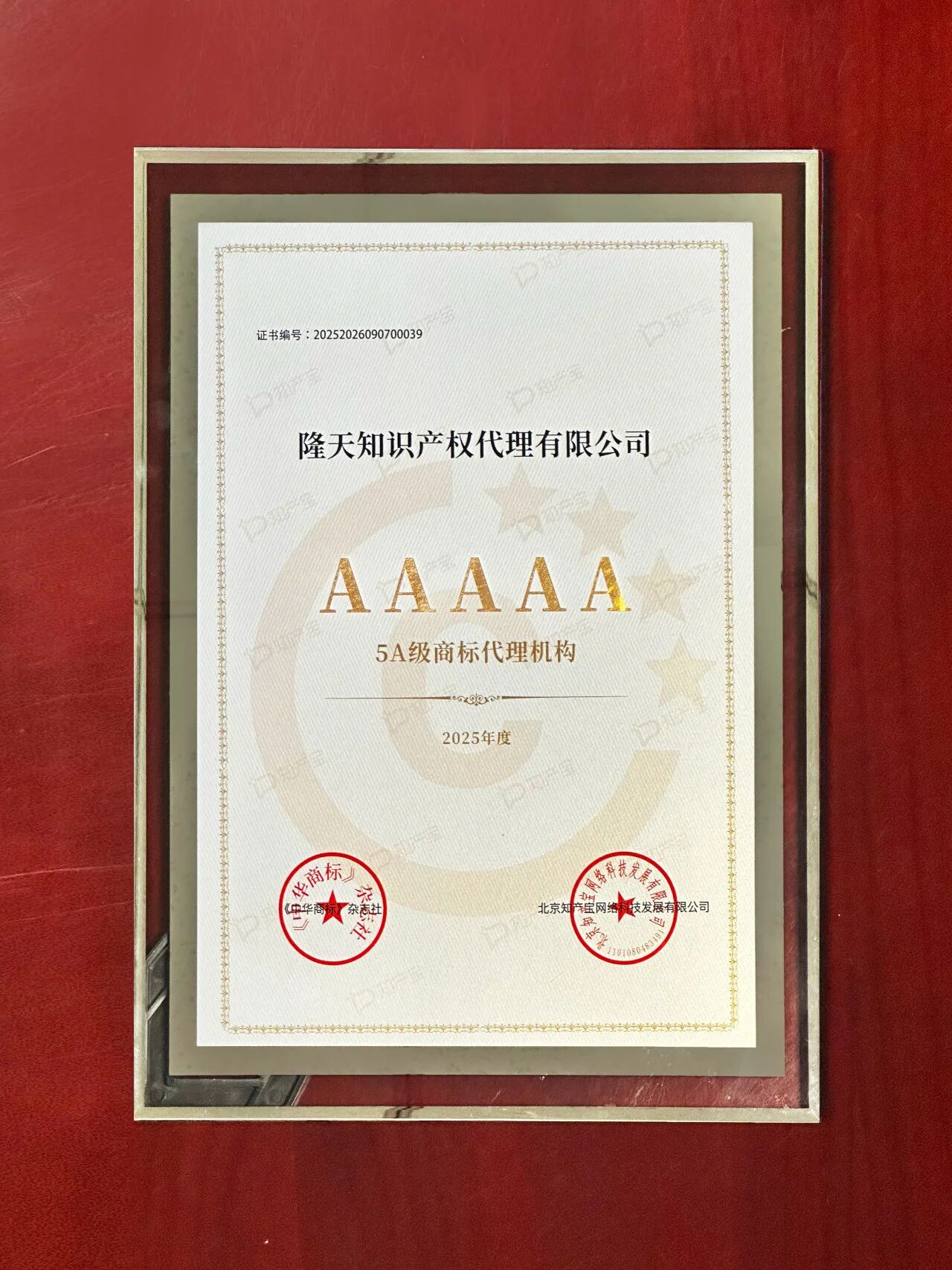 9月5日晚,在商标品牌节欢迎晚宴暨颁奖典礼上,知产宝携手《中华商标》杂志社,在中华商标协会的指导下,正式公布了“2025商标代理服务能力数据统计600”榜单。隆天凭借卓越的专业实力、深厚的市场口碑与高品质的服务水平获权威认可,再度获评5A级商标代理机构,这也是自该榜单2023年首次发布以来,隆天连续第三年获此殊荣。